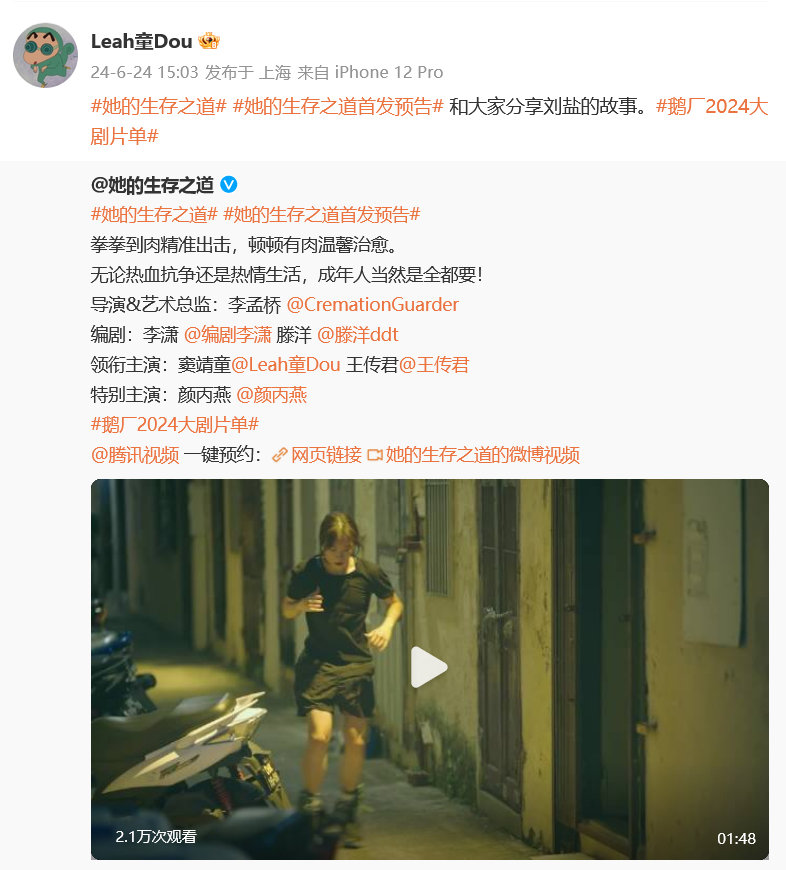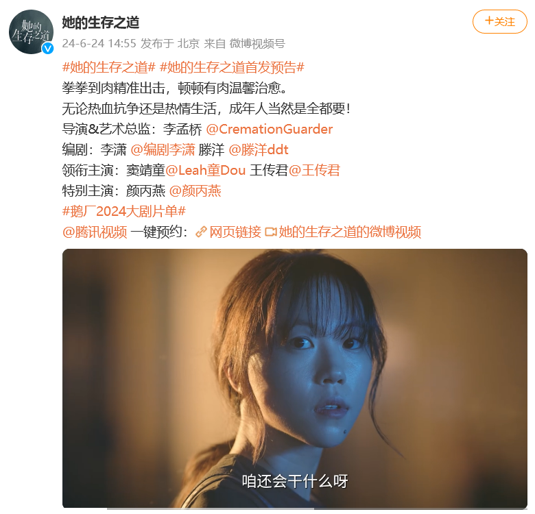 6月24日,电视剧《她的生存之道》首发预告,由窦靖童、王传君主演。