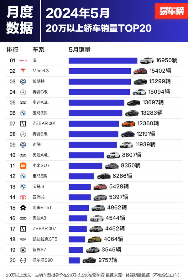 以上不难看出,国内20万元以上轿车市场呈现出多元化竞争态势,新能源汽车与传统燃油车竞相角逐。其中,小米汽车SU7的出色表现无疑为新能源汽车市场注入了新的活力。