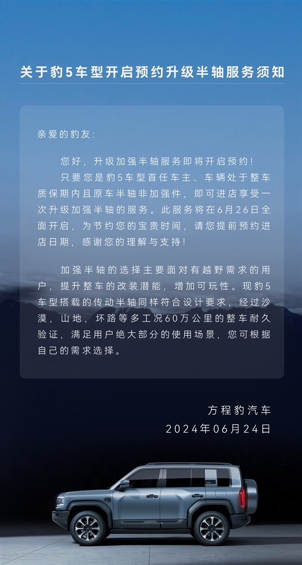 快科技6月24日消息,方程豹汽车官方今日宣布,即将开启方程豹豹5加强半轴服务的预约。