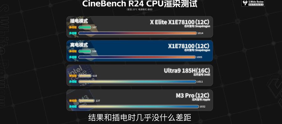 在 @小白评测 的CineBench 2024 CPU渲染测试中,这颗3.4GHz的骁龙X Elite(X1E-78-100)跑到了单线程107,多线程1014,综合表现与Ultra 9版本的YOGA接近,多线程表现与12核的苹果M3 Pro旗鼓相当。