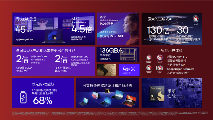 骁龙X Elite的Oryon CPU有着12个高性能核心,最 高主频可达3.8GHz,双核加速技术可将两个核心频率提升到4.3GHz。GPU方面集成了Adreno GPU,算力达到4.6 TFLOPS。此外还拥有AI算力高达45TOPS的Hexagon NPU,相比目前的移动端CPU有着明显优势,带来更强的AI性能。此外,骁龙X Elite还支持8通道 LPDDR5X 8533MHz内存,最 高带宽136GB/S,最 大容量64GB,同时还支持PCIe 4.0 NVMe SSD、UFS 4.0、SD 3.0扩展卡,以及5G、Wi-Fi7和蓝牙5.4。