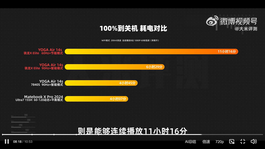 续航方面,大米的测试中找来了搭载AMD锐龙7840S的Yoga Air 14s与Ultra 7 155H的MatePad X Pro作为对照,在相同测试条件下,骁龙X Elite(X1E-78-100)的播放视频续航达到了6小时29分,比另外两款产品不到5小时的续航更为持久,开启节能模式后甚至可以到11小时16分。