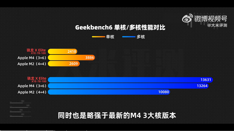 CPU的Geekbench6测试以 @大米评测 为例,骁龙X Elite(X1E-78-100)取得了单核2418,多核13631的成绩,单核表现快要追上苹果M2,而多核表现却是遥遥领先,甚至比苹果刚发布的M4三大核版本还要强一点。