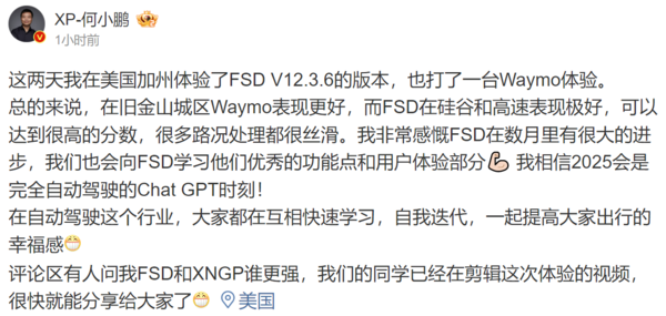 在最后,何小鹏还不忘宣传一下自家的XNGP:“评论区有人问我FSD和XNGP谁更强,我们的同学已经在剪辑这次体验的视频,很快就能分享给大家了。”