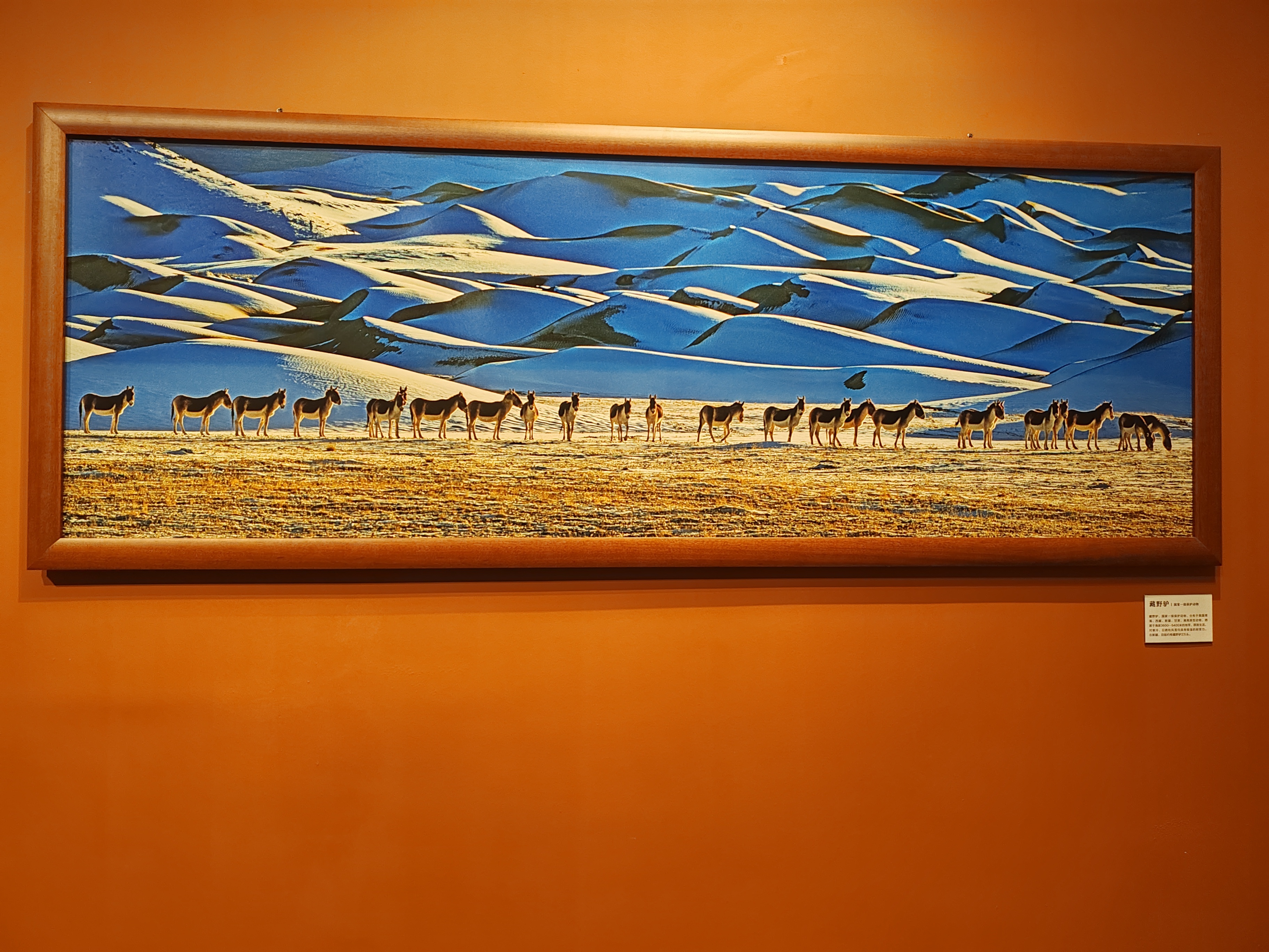 在作品展中,一幅名叫《期盼永恒的宁静》的作品尤为引人注目。画面中,24头藏野驴排着队出现,在柔和的阳光和远处的雪山映衬下,显得格外宁静而唯美。这幅作品不仅展现了藏野驴的优雅与从容,更传递出冯刚对大自然和谐共生的深深期盼。