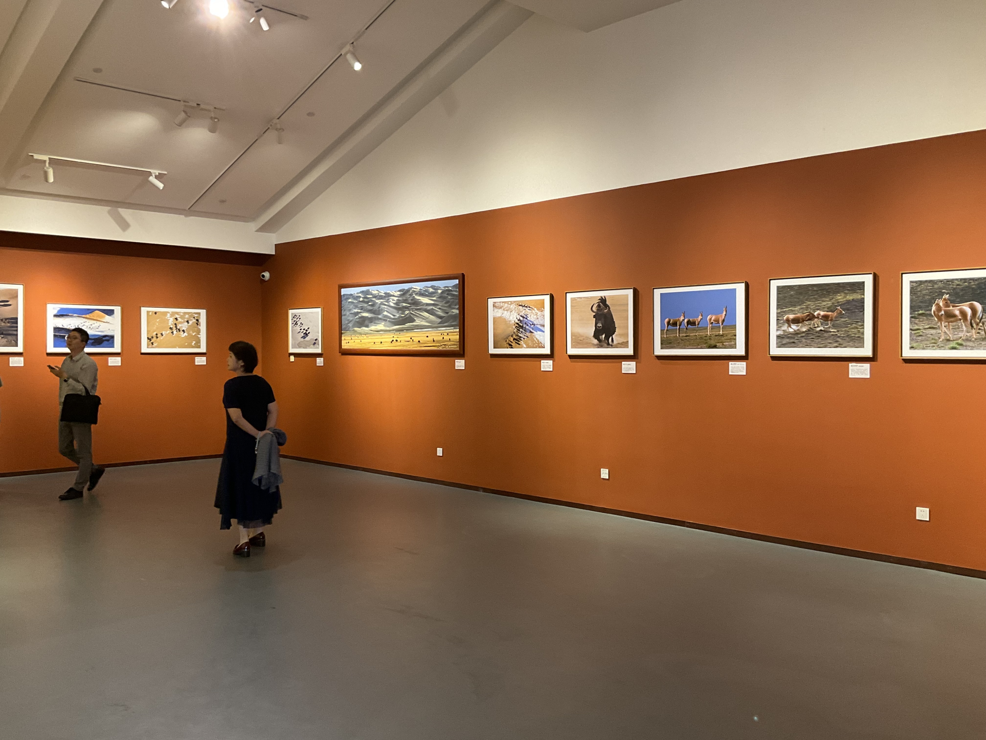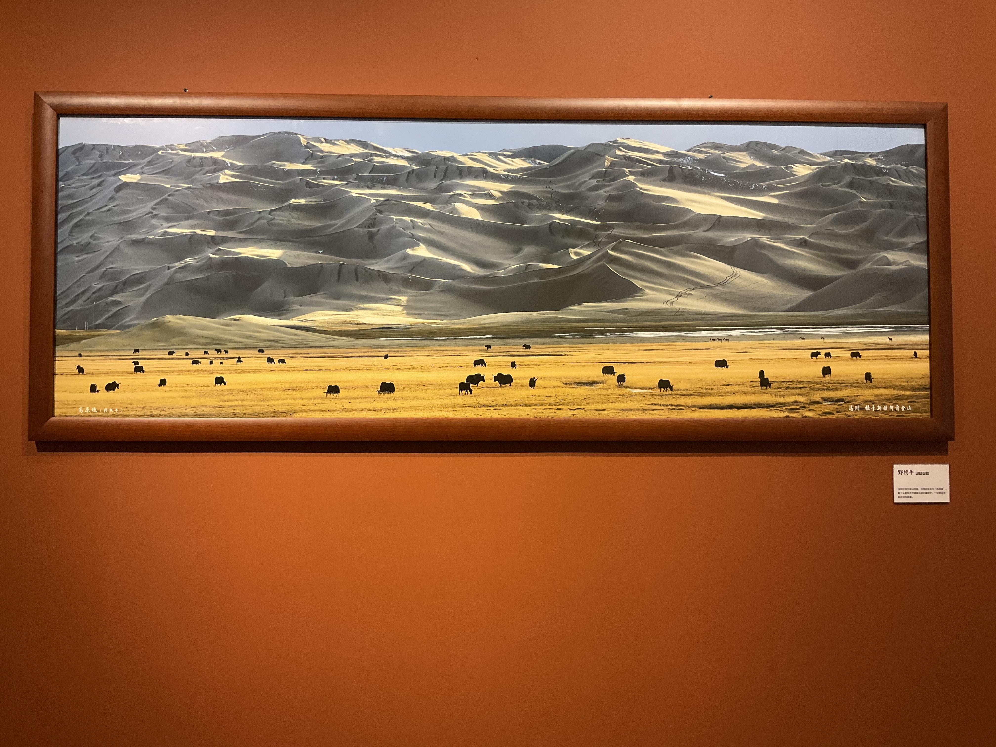 在乡村美术馆展厅里,冯刚详尽地分享了每一幅作品背后的故事,他曾经冒着严寒与危险,在阿尔金山上空航拍野牦牛;乘坐四围没有舱门的动力三角翼,打破了阿尔金山上空无飞行的历史记录;凭借他坚强的勇气和坚定的毅力,记录下58头“高原之舟”野牦牛奔腾驰骋于高原沙山的壮观景象。冯刚表示,本次摄影展结束之后,所有作品将全部捐给自己的家乡廊下,用自己的方式,传递并呼吁人们关注野生动物的保护,珍爱生态环境。