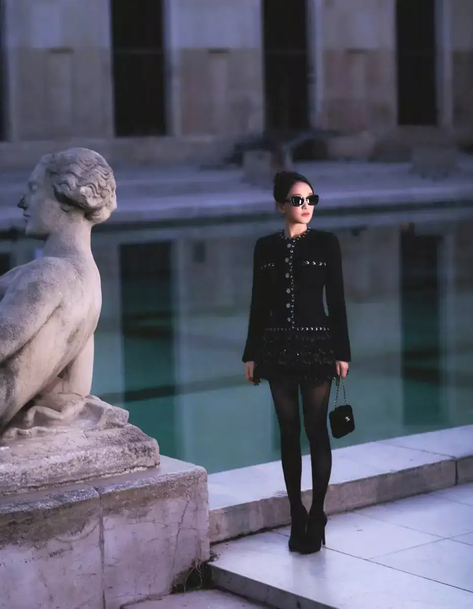 周迅巴黎看秀造型曝光 穿黑色小香风套装性感酷飒