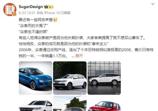 上述博主在微博上表示:最近有一些网友声音,“众泰'死'得太冤了”“众泰生不逢时啊”,有些人觉得众泰破产是因为它长期抄袭,大家审美提高了就不想买山寨车了。恰恰相反,众泰的成功就是因为它的抄袭和“拿来主义”。