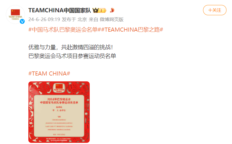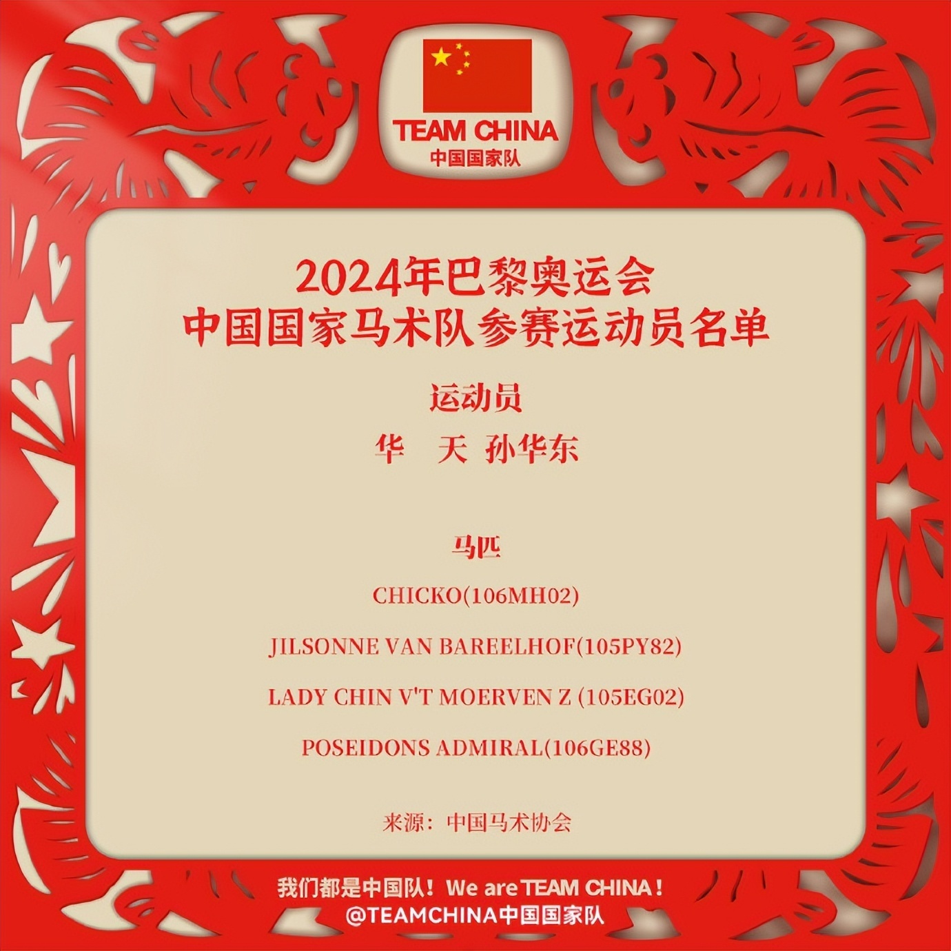 6月25日,中国马术协会公示国家马术队入选巴黎奥运会运动员及马匹名单。