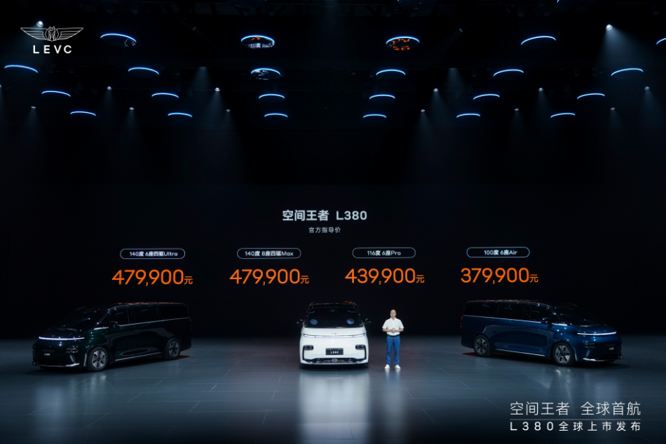 6月25日,LEVC翼真汽车旗下“空间王者”——L380正式上市,共计推出100度6座Air版、116度6座Pro版、140度8座四驱Max版及140度6座四驱Ultra版4款车型,官方指导价37.99万元-47.99万元。
