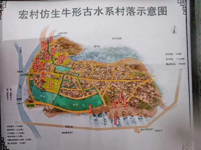 宏村北靠雷岗山,西溪在村西自北向南流去,整个村庄形似一头平卧的青牛。在牛头附近有一个水闸,这也是全村水圳的入水口,西溪的水自此流经村庄,穿巷而过,汇入形似“牛胃”的月沼。后经过滤,又绕屋穿户,最终流入被称为“牛肚”的南湖。