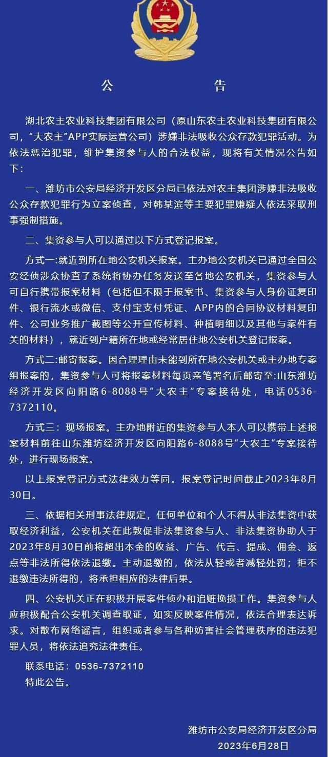 据潍坊市公安局 2023 年 6 月 28 日发布的一则公告,大农主 APP 实际运营公司湖北农主科技集团有限公司(原山东农主农业科技集团有限公司)涉嫌非法集资被立案调查,对韩某滨等主要犯罪嫌疑人依法采取刑事强制措施。2024 年 6 月,多位投资者从潍坊市寒亭区检察院得知,目前案件已由公安机关移交该院审查起诉。