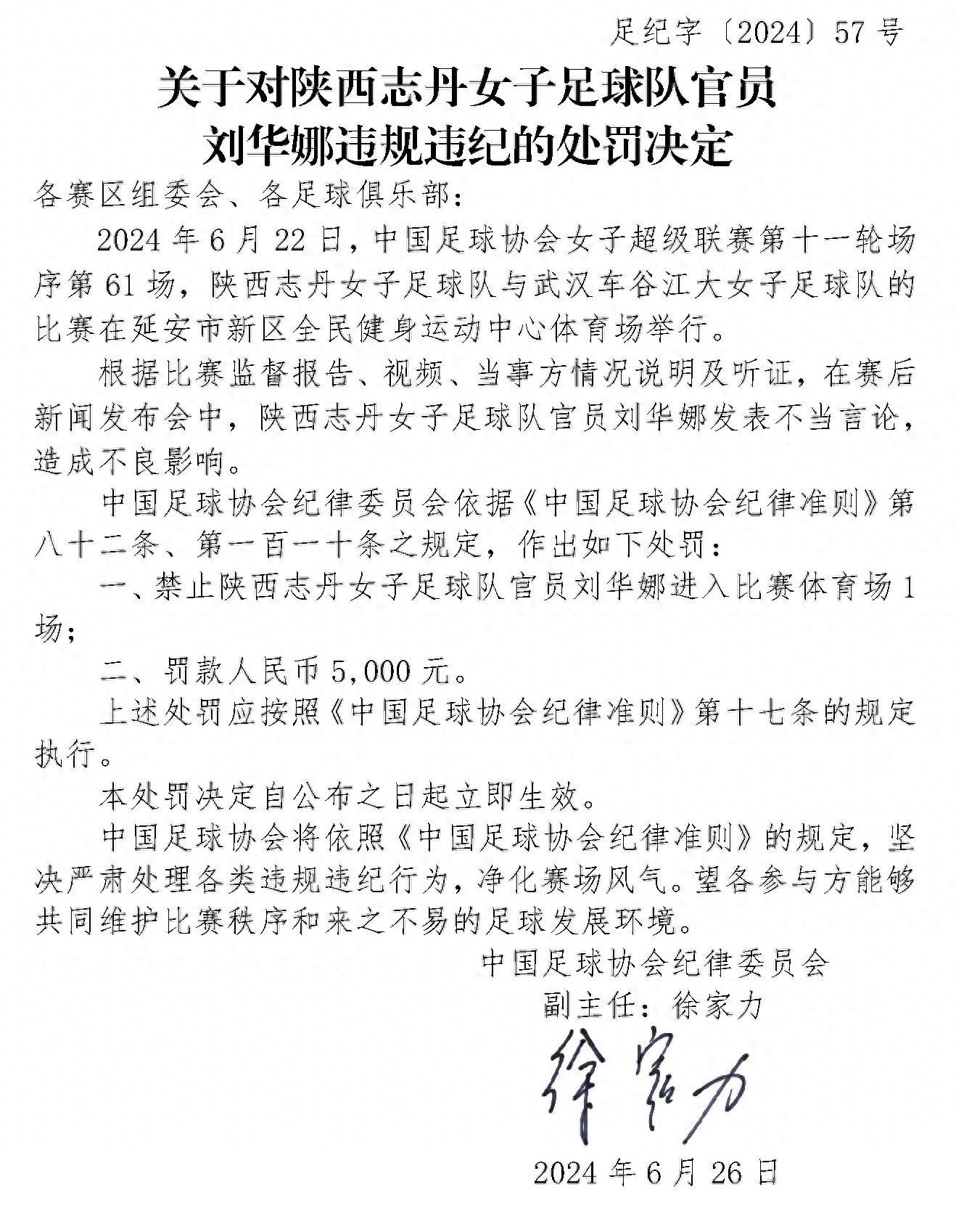 6月27日,中国足协官网公布关于对陕西志丹女子足球队官员刘华娜违规违纪的处罚决定。