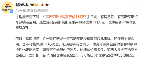 近日,有消息报道称,有劳斯莱斯汽车经销商反映,现款5座版劳斯莱斯库里南现金优惠111万元,优惠后新车售价低至580万。这一消息随即也在网络上引起热议。不过有经销商回应称,即使算上豪车税,也不可能做到100万优惠。但该经销商也表示,像劳斯莱斯会提供给客户多种个性化定制方案。如果客户选配内容较多,比裸车价贵很多,销售人员会在选配方面给出一些折扣,各个项目优惠幅度叠加,有可能出现“优惠”超过100万的情况。