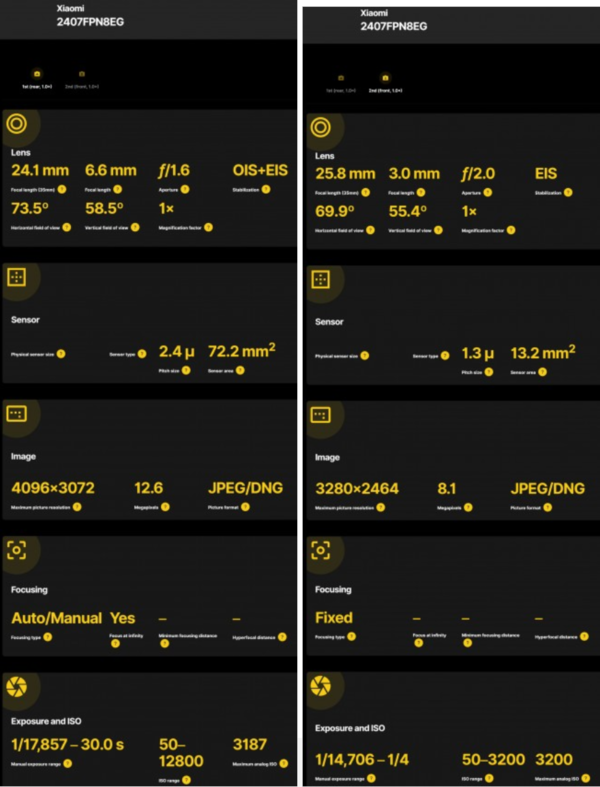 值得注意的是,拥有相同型号代码的智能手机在Camera FV-5的数据库中已显示了其主摄像头和前置摄像头的规格。数据库中提到主摄像头的分辨率为12.6MP,但这可能是由于像素合并技术,实际分辨率可能达到50MP。而前置摄像头的分辨率则为8.1MP。