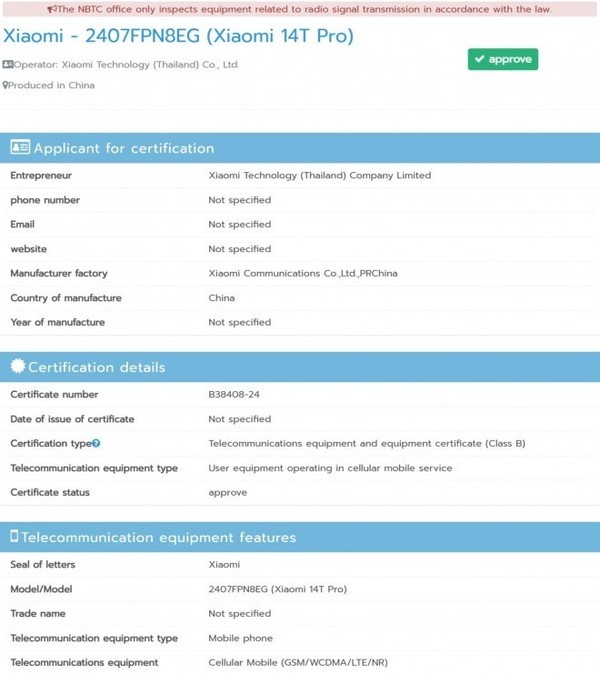 【CNMO科技消息】近日,据外媒消息,备受关注的小米14T Pro已通过泰国NBTC认证,这意味着其发布在即。尽管泰国认证机构并未透露小米14T Pro的具体规格,但其型号代码2407FPN8EG 已被披露。这一进展标志着这款备受期待的智能手机离正式发布又近了一步。