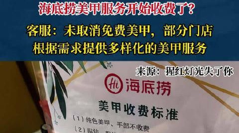 【#海底捞有门店推出美甲收费标准#, 客服:#海底捞未取消免费美甲#,部分门店根据需求提供多样化服务】6月26日,有网友发帖称一海底捞门店推出了美甲收费新标准。新标准规定:纯色美甲、手部不收费,而贴钻、甲片、穿戴甲、花式收费从9.9元到69元不等,或用数量一定的捞币兑换。对此海底捞客服回应称,收费美甲服务是近期才推出的,门店根据商圈情况及顾客整体体验,提供多样化的美甲服务。原有的纯色美甲,和手部护理依旧免费提供。
