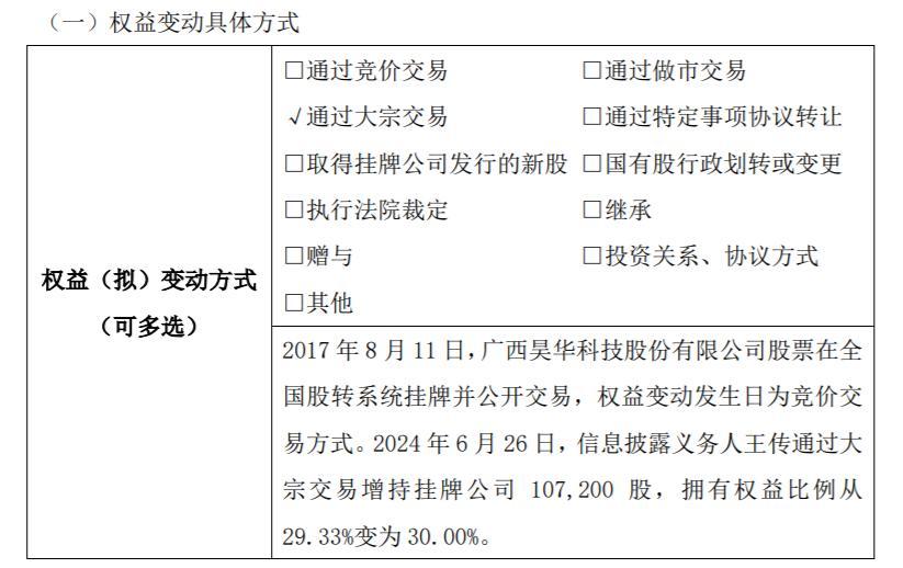 2024年6月26日,股东王传通过大宗交易增持挂牌公司107,200股,拥有权益比例从29.33%变为30.00%。