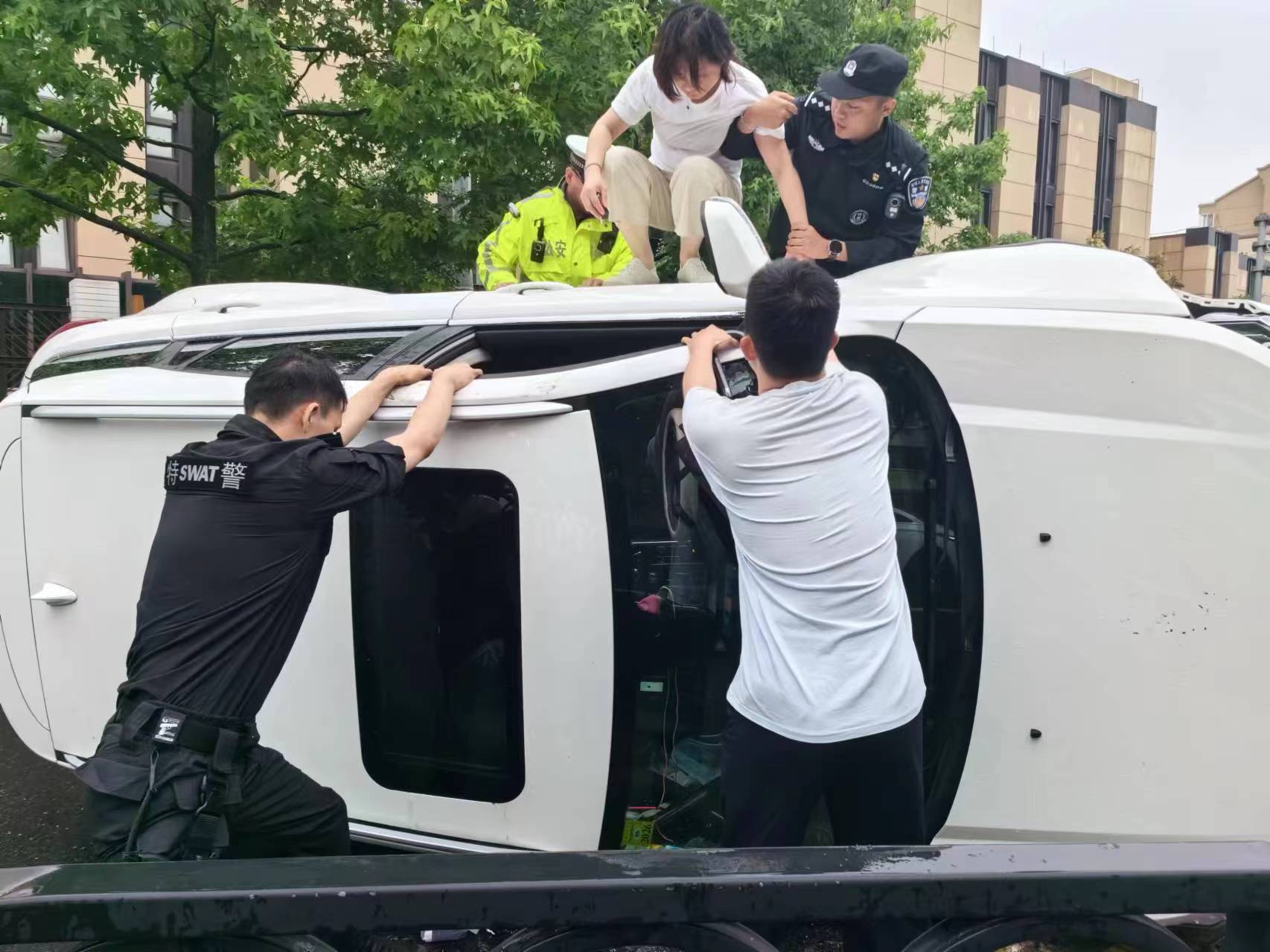 6月19日晚高峰,在奉贤区南奉公路9555号附近发生一起交通事故,一女司机在沿南奉公路由西向东行驶过程中不慎撞向马路中间的隔离柱,事故造成车辆侧翻,司机被困其中。此时,巡逻经过的奉贤特警支队的民警立即下车上前查看情况,发现一女性驾驶员被突如其来的事故吓得精神恍惚。因车辆侧翻造成车门失灵,特警队员随即与前来增援的交警、热心市民一齐帮助女司机脱困。