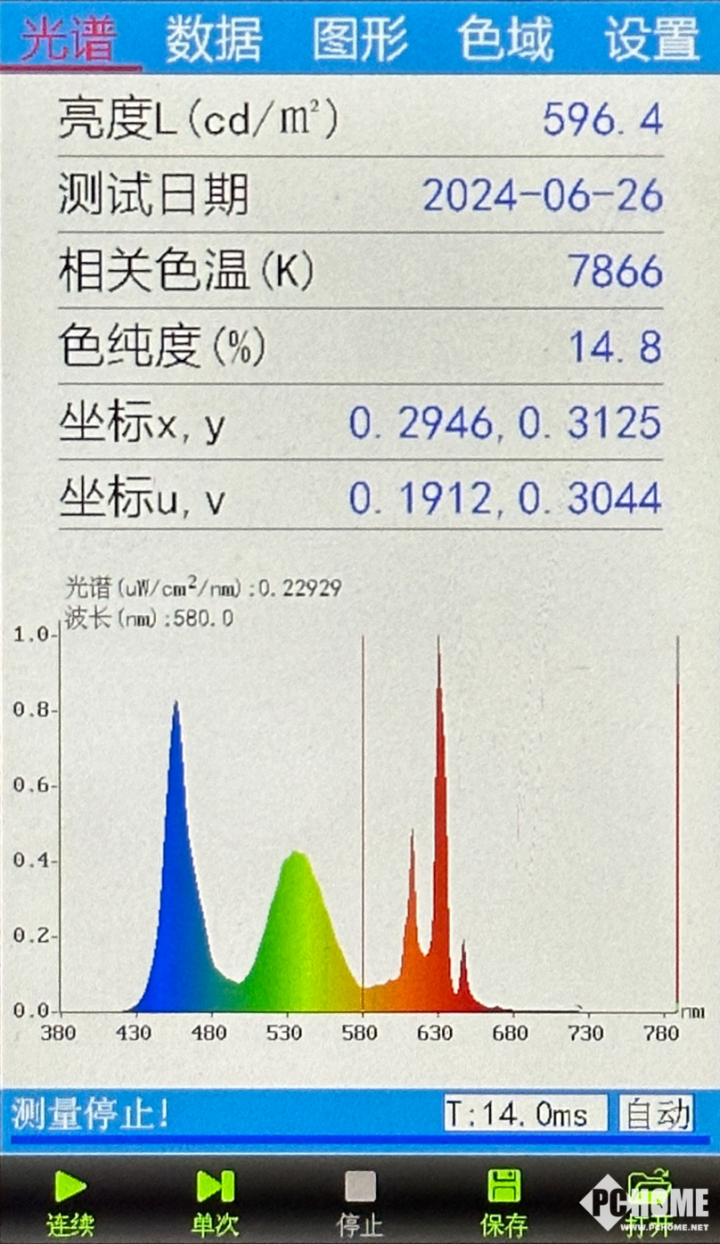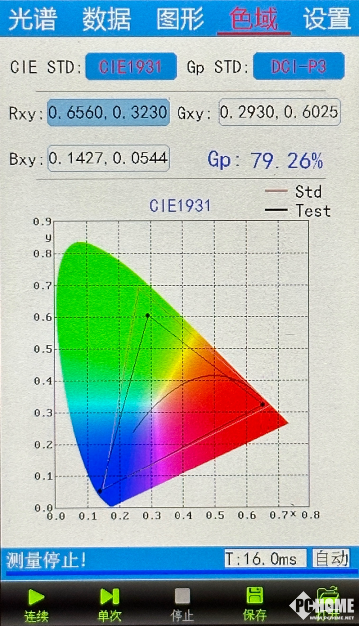 实测下来的全局亮度为594nit,峰值亮度可以达到850nit左右。不过其DCI-P3色域覆盖面积只有79.26%,且是在鲜艳显示模式下测得的数据,相对来说仅能满足日常使用。