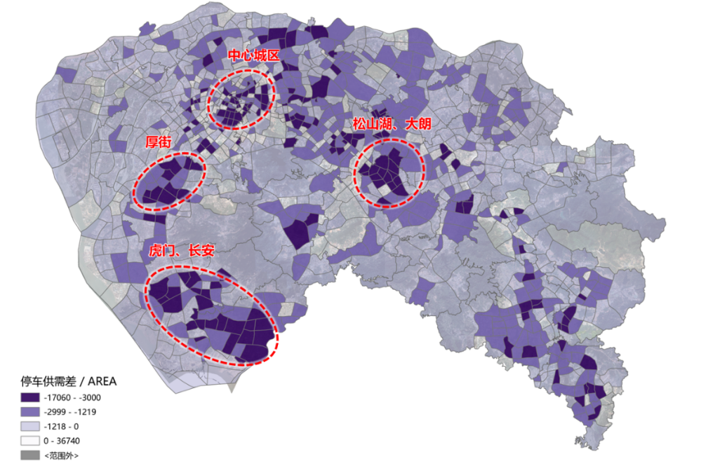 ▲东莞市停车设施供需关系分布图