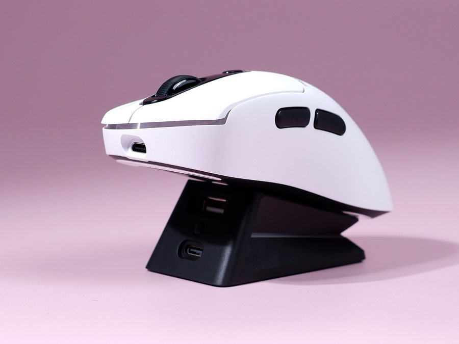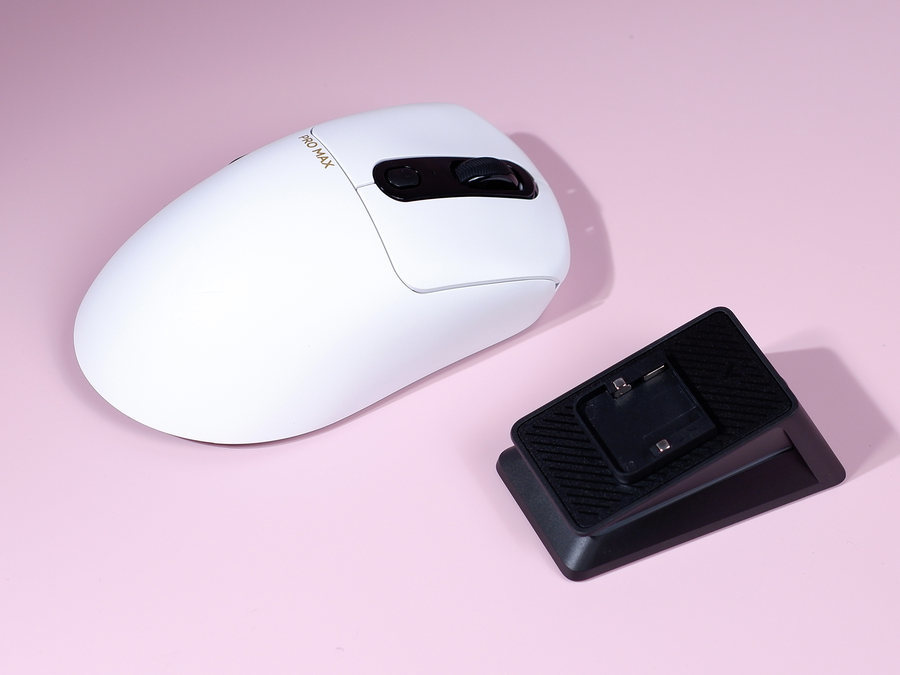 取下雷柏VT3PRO MAX鼠标底部的无线接收器的仓盖,换上触点充底盖,便可将这款鼠标吸附在P5充电底座上面,进行充电操作。
