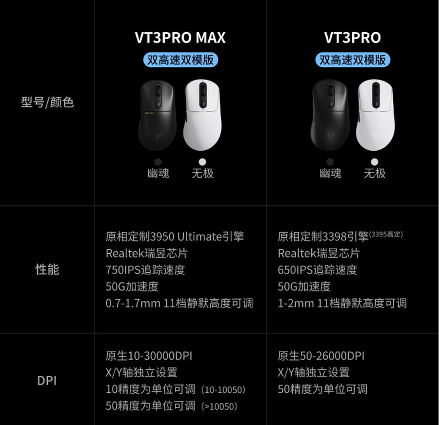 要说区别,它们的主要区别在于鼠标内部的配置。其中尤为明显的区别就是光学引擎不同。VT3PRO MAX采用的是全新的原相定制3950 Ultimate旗舰引擎。而VT3PRO采用的是原相3398引擎,产品定位是要低于VT3PRO MAX的。根据搭配不同的配置,厂家划分出了不同性能的鼠标型号,以便满足不同的细分市场。