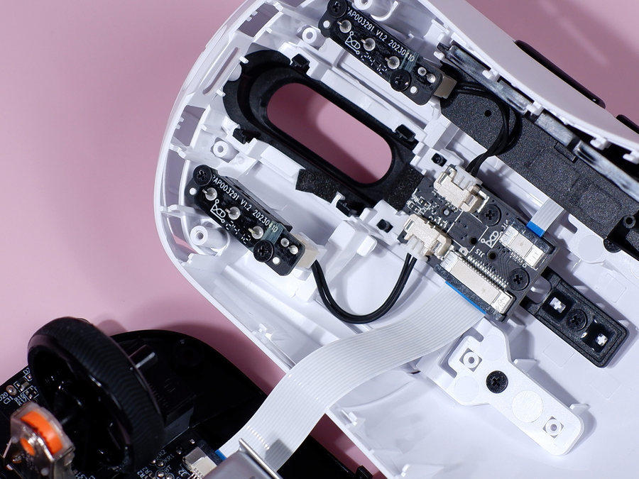 这款鼠标采用了雷柏C+click分离式按键预压校调技术,但是比较不一样的地方是,这次针对非对称鼠标做了创新调整,采用等距支点较调,减少力的分解,可以保证非对称结构,手感按压一致。左右键微动架构独立设计,支持按键手感一致性独立校调,按键触发回弹独立校调。拧动微动PCB上面的螺丝,调整松紧,便可调节左右键力度,很是方便。