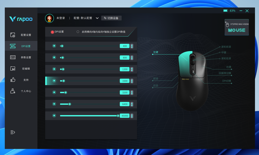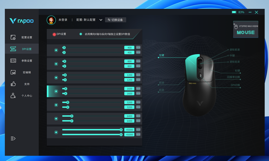 全新原相定制3950 Ultimate旗舰引擎的加持,令雷柏VT3PRO MAX支持高达45000的DPI(超频)。