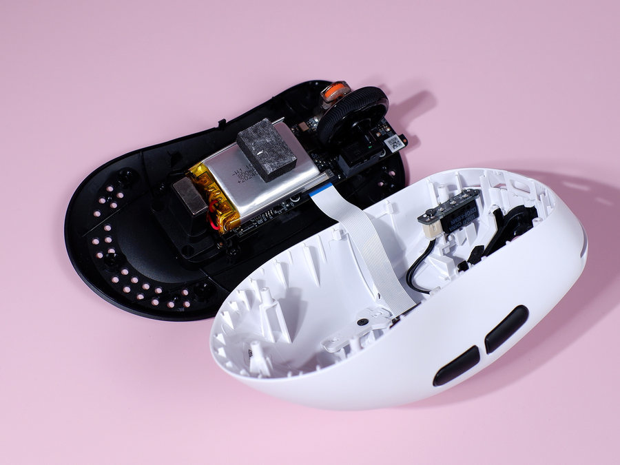雷柏VT3PRO MAX鼠标底部脚垫隐藏着5颗螺丝钉。把螺丝钉全部取下,便可把这款鼠标拆开。