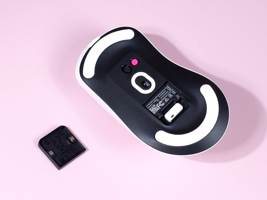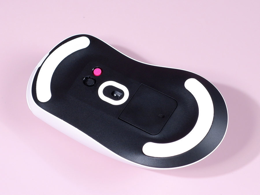 再来看鼠标底部。其设计有一个鼠标开关以及一个粉色按键。这个粉色按键可以自定义,其出厂默认的功能是回报率切换。