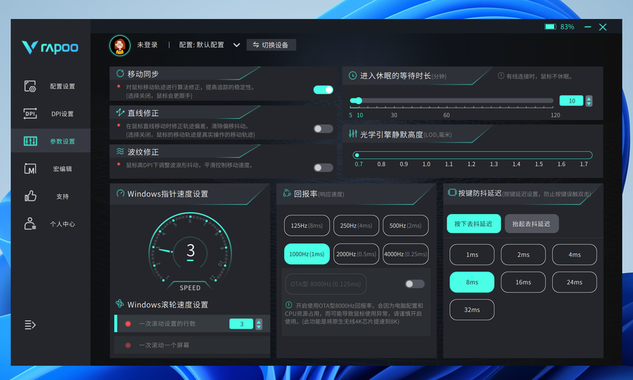 RapooGameDev是雷柏键鼠的控制中心。在这里可以对这2款VT3双高速系列无线游戏鼠标进行详细的性能设置。