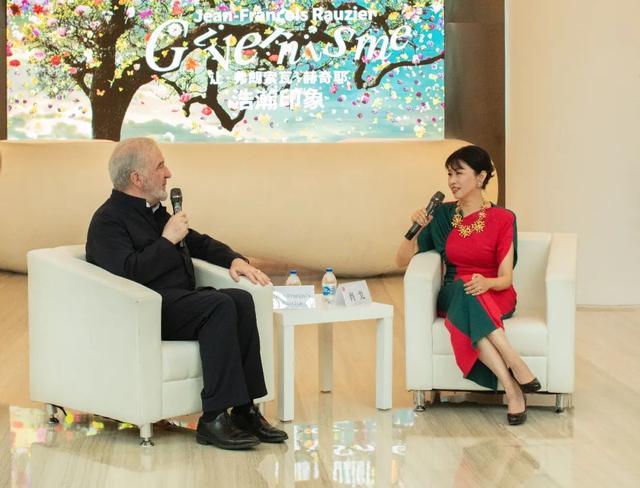 ▲ 让·弗朗索瓦·赫奇耶 (Jean-François Rauzier) 对话凤凰艺术总编辑、副总裁、凤凰中心馆长,此次展览策展人肖戈,2024年,凤凰中心