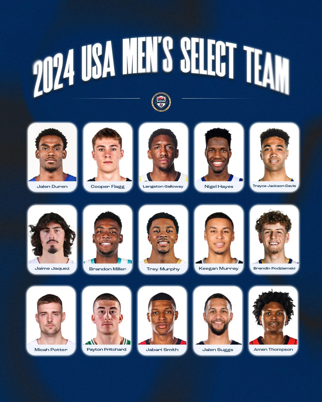 2024年美国国家篮球队中有6名成员曾入选过精选球队,包括德文-布克(2016年)、凯文-杜兰特(2008年)、安东尼-爱德华兹(2021年)、泰瑞斯-哈利伯顿(2021年)、朱-霍勒迪(2012年)和科怀-伦纳德(2012年)。