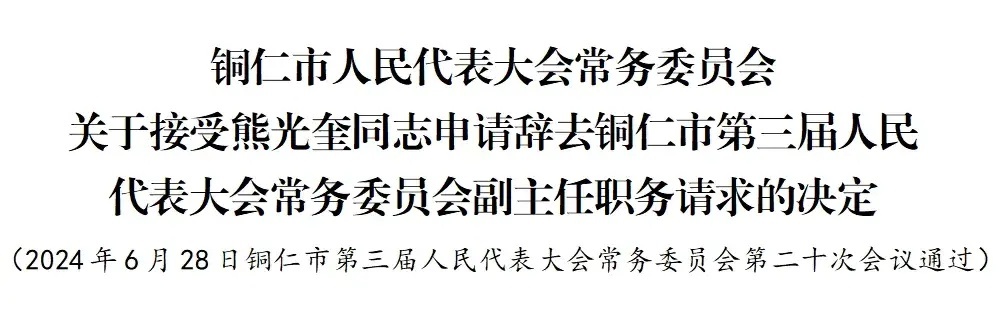 根据《中华人民共和国地方各级人民代表大会和地方各级人民政府组织法》和《铜仁市人民代表大会常务委员会人事任免办法》的有关规定,铜仁市第三届人民代表大会常务委员会第二十次会议决定:接受熊光奎同志申请辞去铜仁市第三届人民代表大会常务委员会副主任职务请求,报铜仁市第三届人民代表大会第五次会议备案。