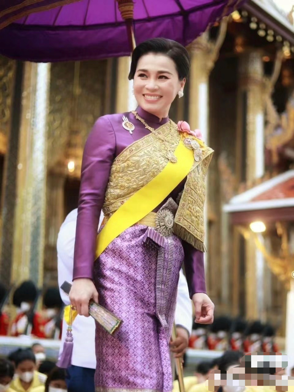 各界名流身着紫色传统泰服进宫,恭谦祝贺。