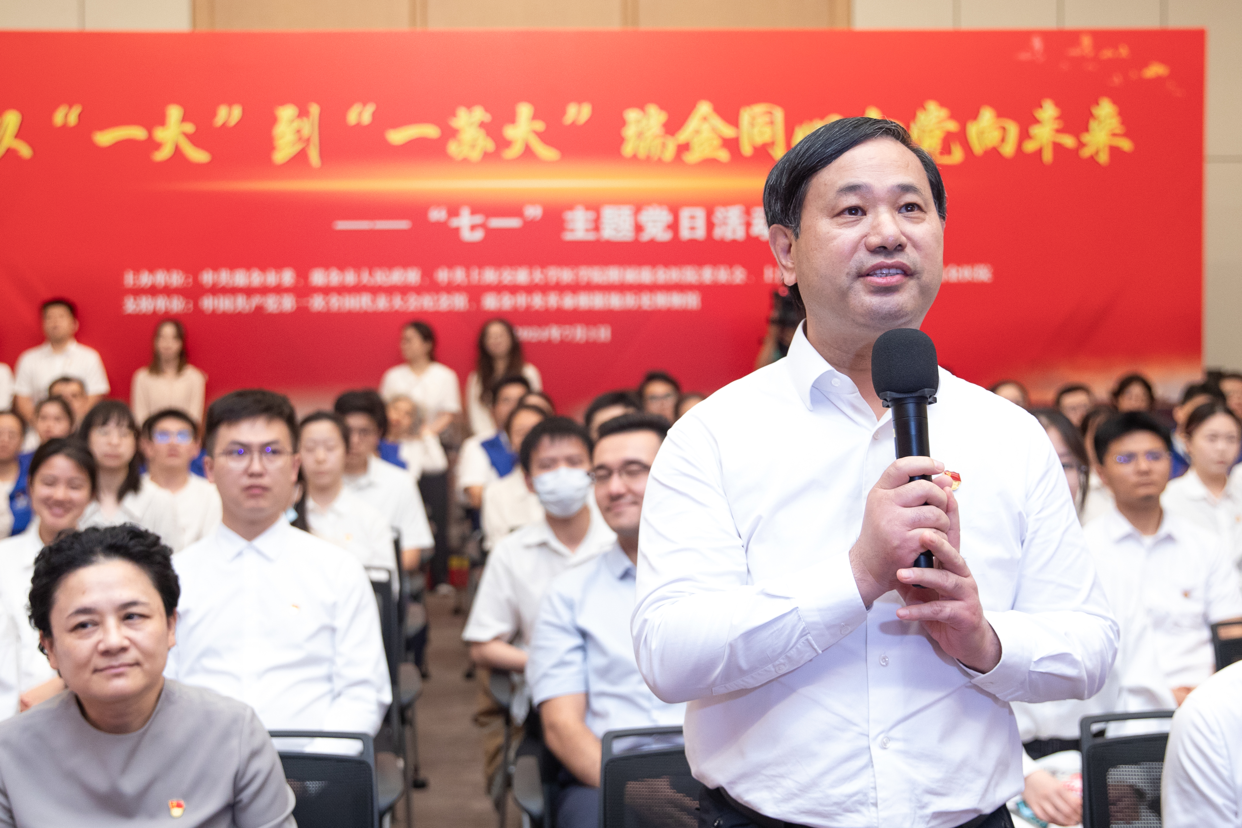 江西瑞金叶坪革命旧址群活动现场,与上海一大会址现场连线,两地瑞金医院的医务人员举行新老党员宣誓仪式,重温入党誓词。上海瑞金医院党委书记瞿介明表示,江西瑞金是见证整个我国革命发展的一个圣地,瑞金医院和江西瑞金这座英雄的城市很有缘分,不仅同名,在健康医疗方面多有合作,坚守初心、守护生命,是永恒的承诺。