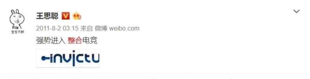 “国民老公”王思聪带着老爸王健林给的5个亿,进入电竞行业,于2011年8月收购了CCM战队,并重组为IG电竞俱乐部。王思聪还发布微博高调宣称:“强势进入,整合电竞”。