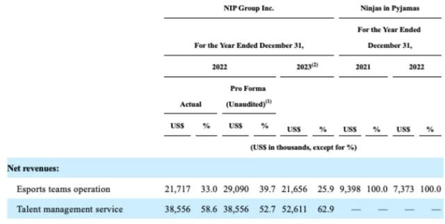 其中比赛奖金收入只占了一小部分,截至2023年底,星竞威武集团的两大战队eStar和NIP分别获得奖金7720万元、820万美元(约合6000万元)。2023年,星竞威武集团的电竞团队运营业务的营收为2165.6万美元(约合1.57亿元),占比约为25.9%,为第二大营收来源。