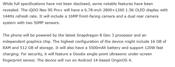 性能方面,iQOO Neo 9S Pro+将采用最新的骁龙8 Gen 3移动平台,搭配独立图形芯片,最高可选16GB RAM与512GB存储空间,确保了强悍的运算能力和出色的游戏体验。内置5500mAh大容量电池,支持120W超级闪充技术。安全方面,该机配备了汇顶科技的单点超声波屏下指纹传感器,使用体验应该强于同价位大部分机型的光学屏幕指纹解锁。
