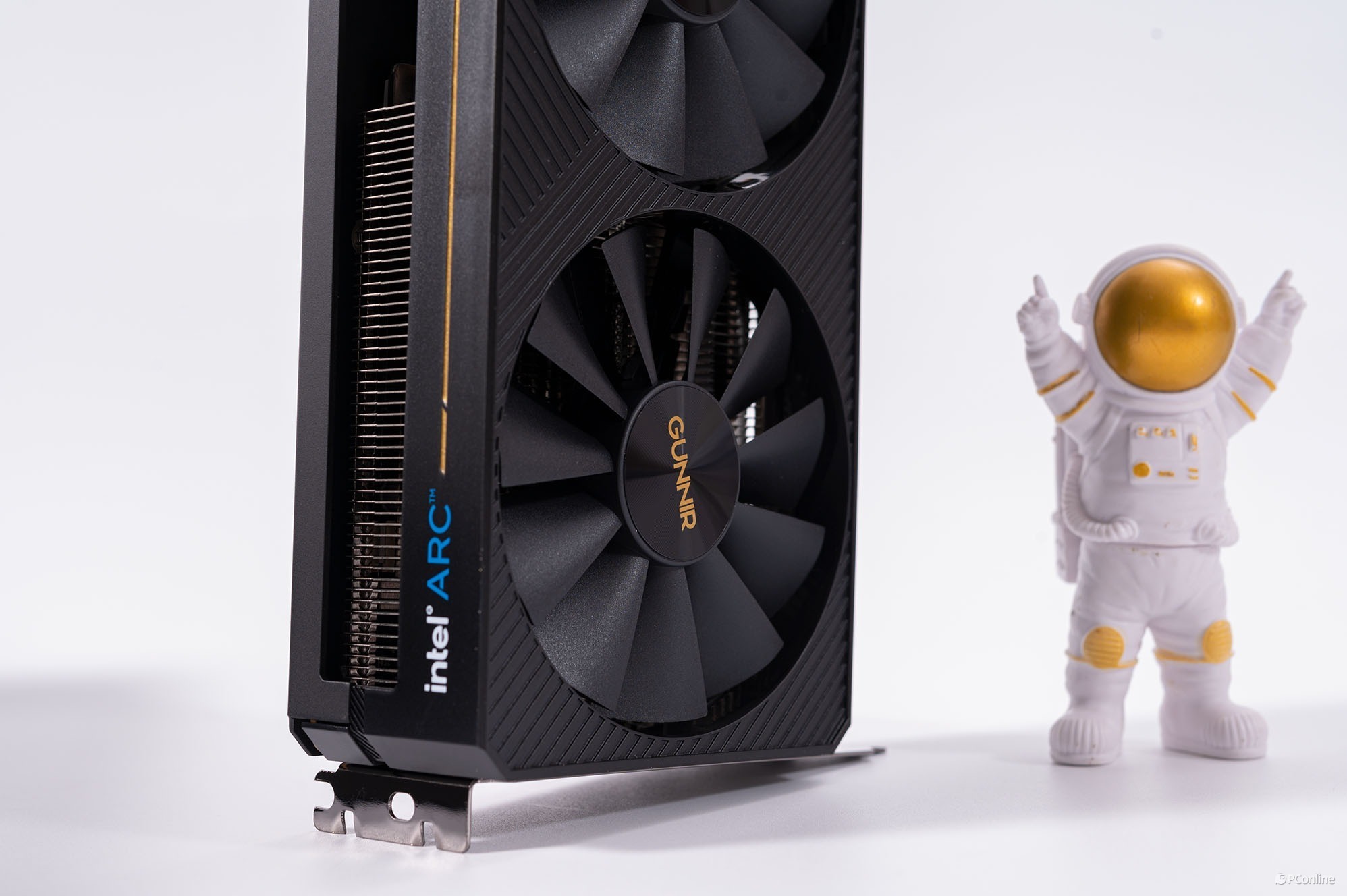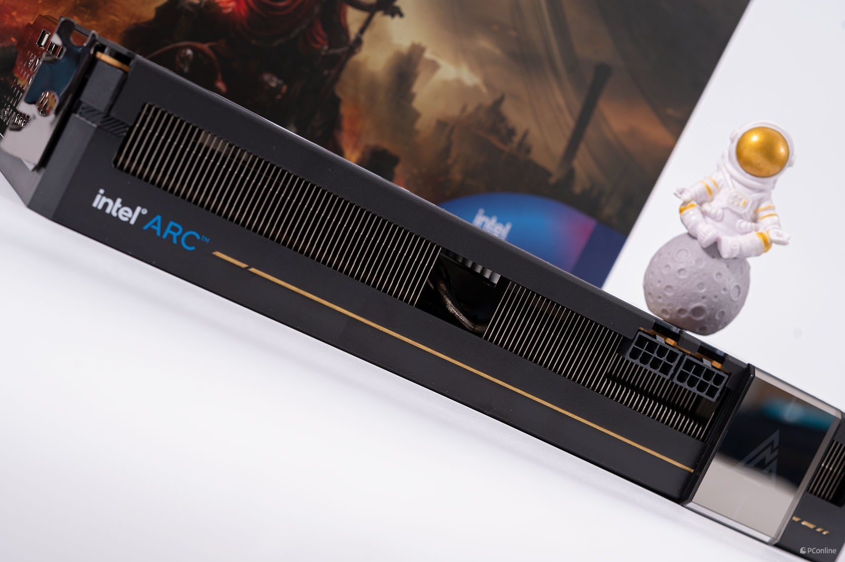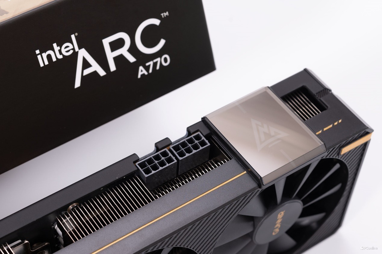 显卡的另一侧则是“intel ARC”标识,还有一条金色的缎带一路延伸至另一边,配合蓝戟Logo灯,给简约的外观增添了一抹鲜艳。