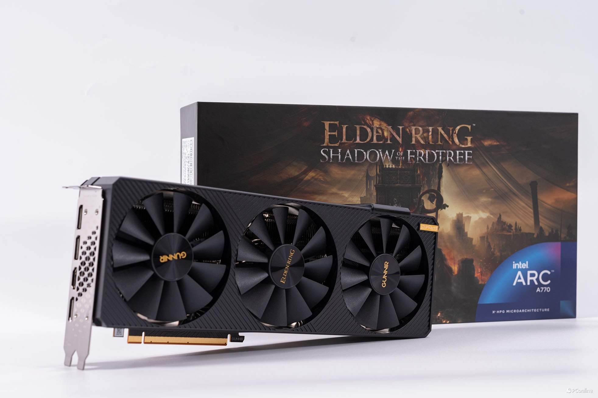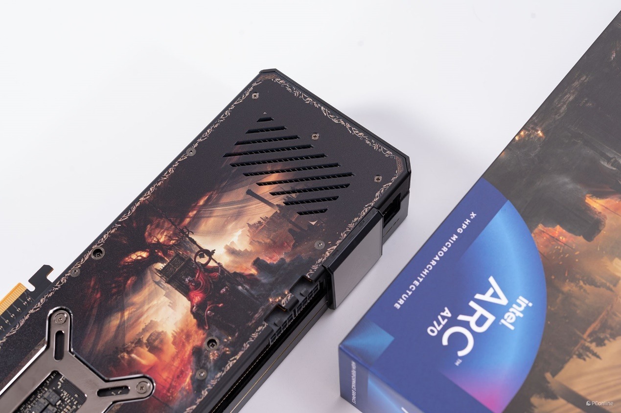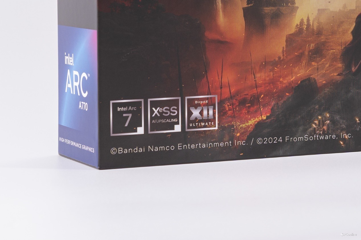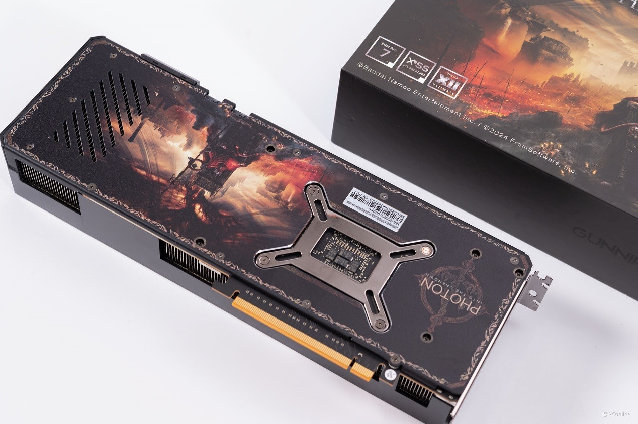 初次拿到蓝戟Intel Arc A770艾尔登法环联名款显卡就被它的外包装震惊到了,其采用的是定制包装,正面就是艾尔登法环黄金树幽影DLC的封面,相当帅气,游戏粉一定喜欢。