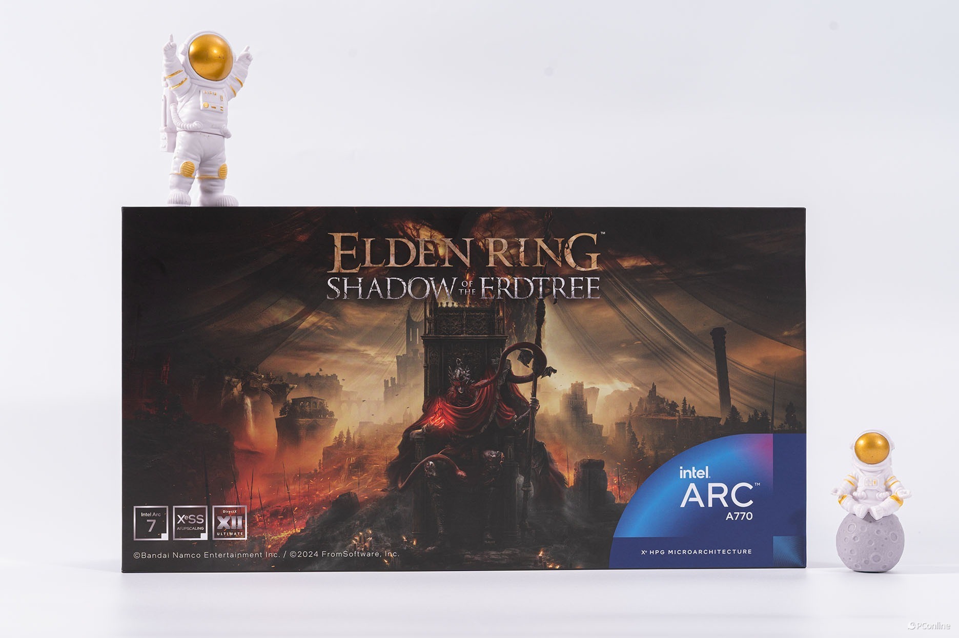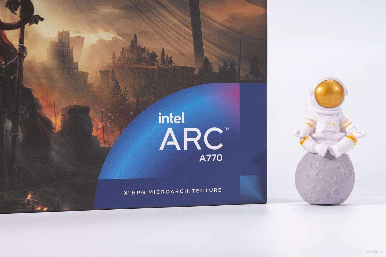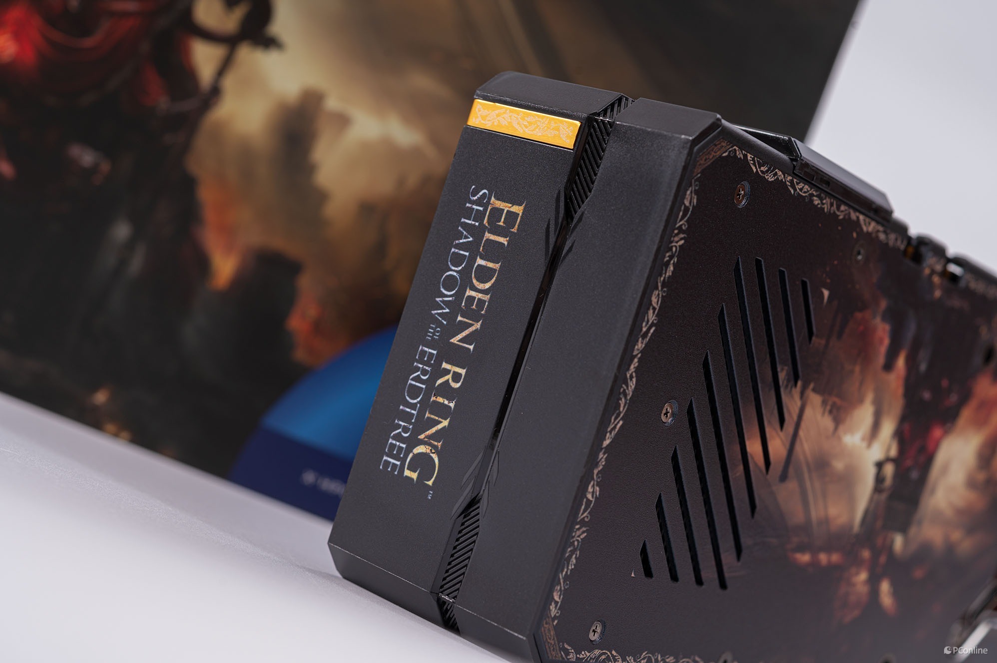 初次拿到蓝戟Intel Arc A770艾尔登法环联名款显卡就被它的外包装震惊到了,其采用的是定制包装,正面就是艾尔登法环黄金树幽影DLC的封面,相当帅气,游戏粉一定喜欢。