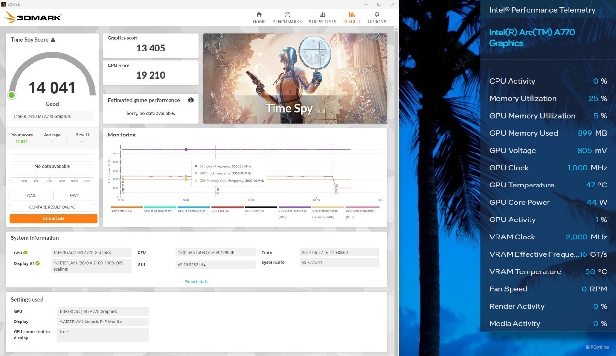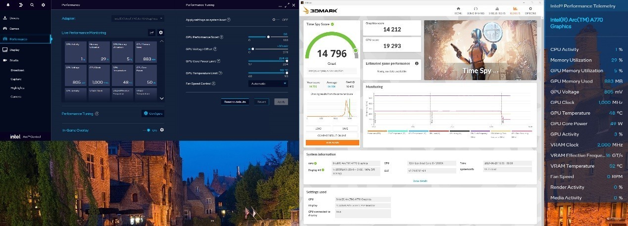看过了AI性能测试,再给你看点极客玩家的最爱——超频!上面我们提到英特尔Arc控制器内可以轻松调节显卡的频率,实现一键超频。默认状态下,蓝戟Intel Arc A770艾尔登法环联名款的Time Spy得分为13405分。