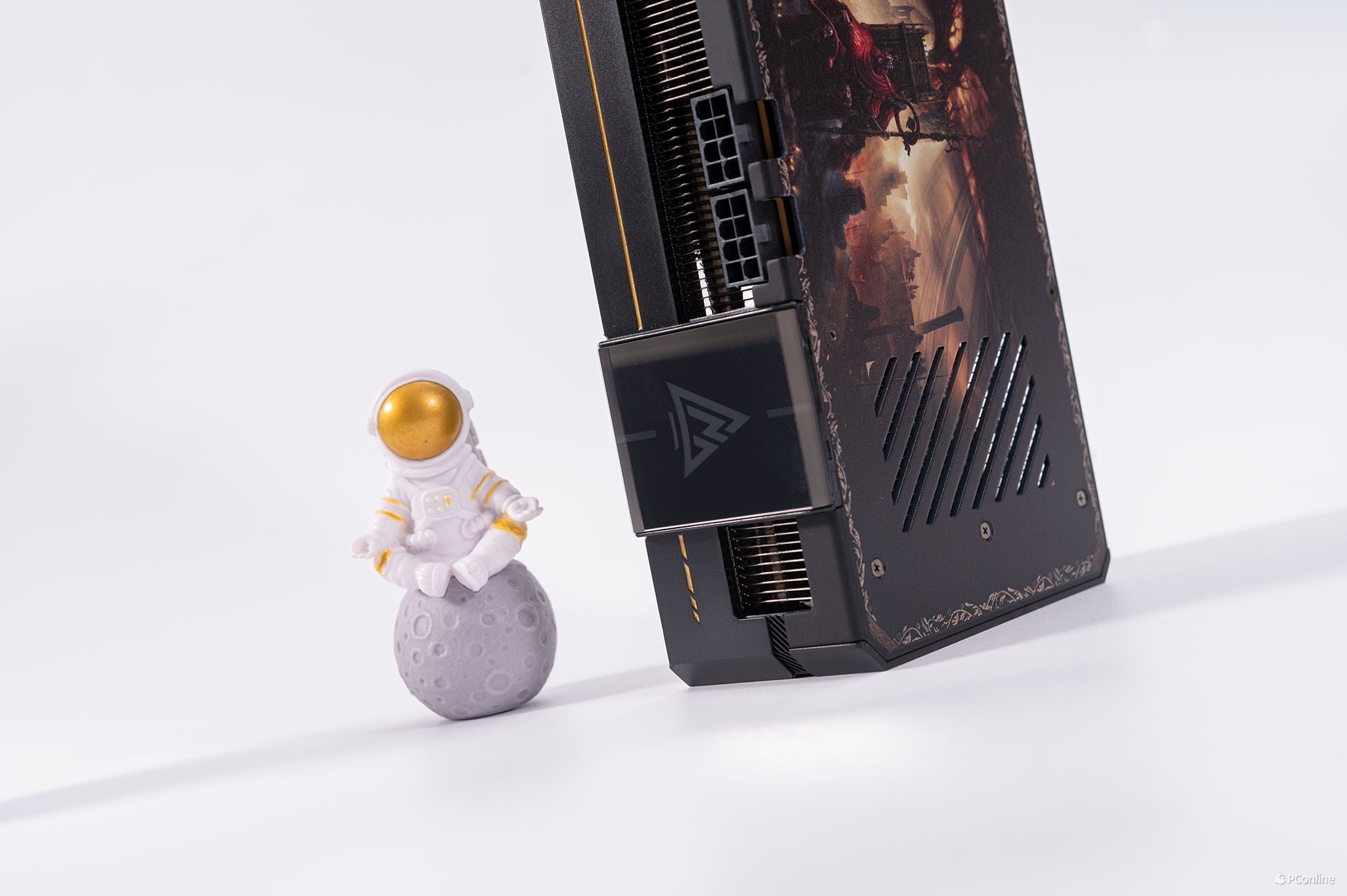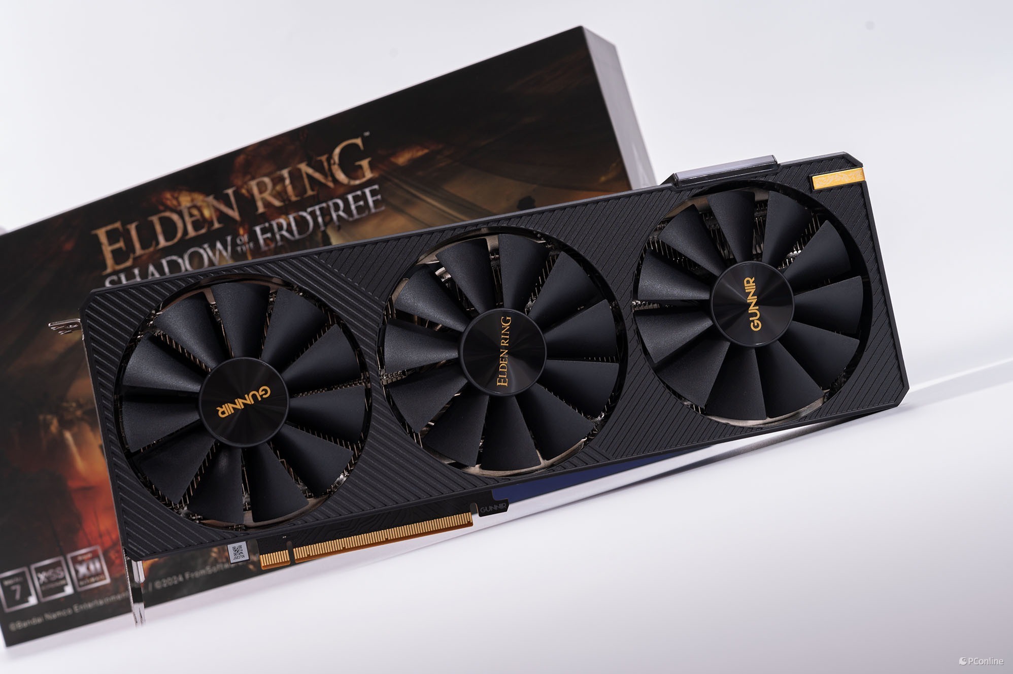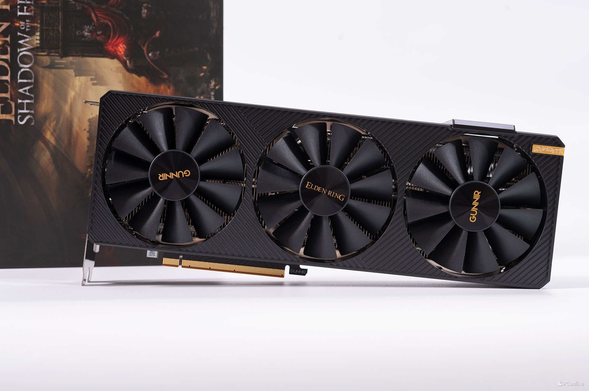 蓝戟在设计这款显卡时很明显费了不少心思,显卡上有很多游戏特色装饰,显卡侧面印有艾尔登法环黄金树幽影的Logo,旁边还有复古的金色花纹装饰件,相当精致。