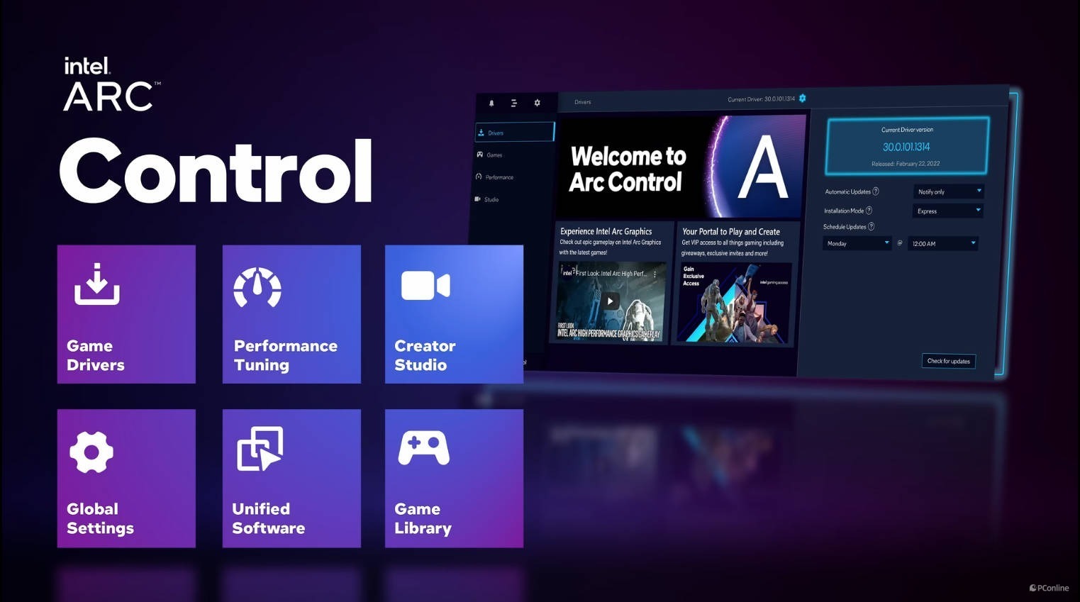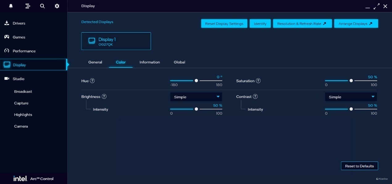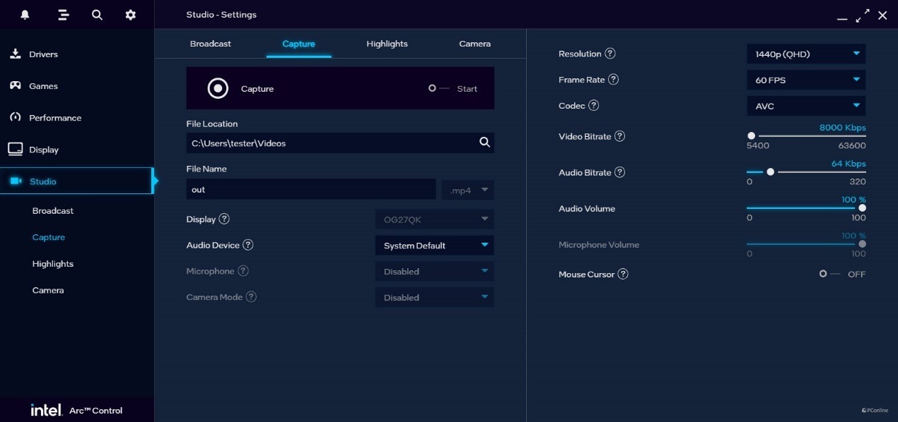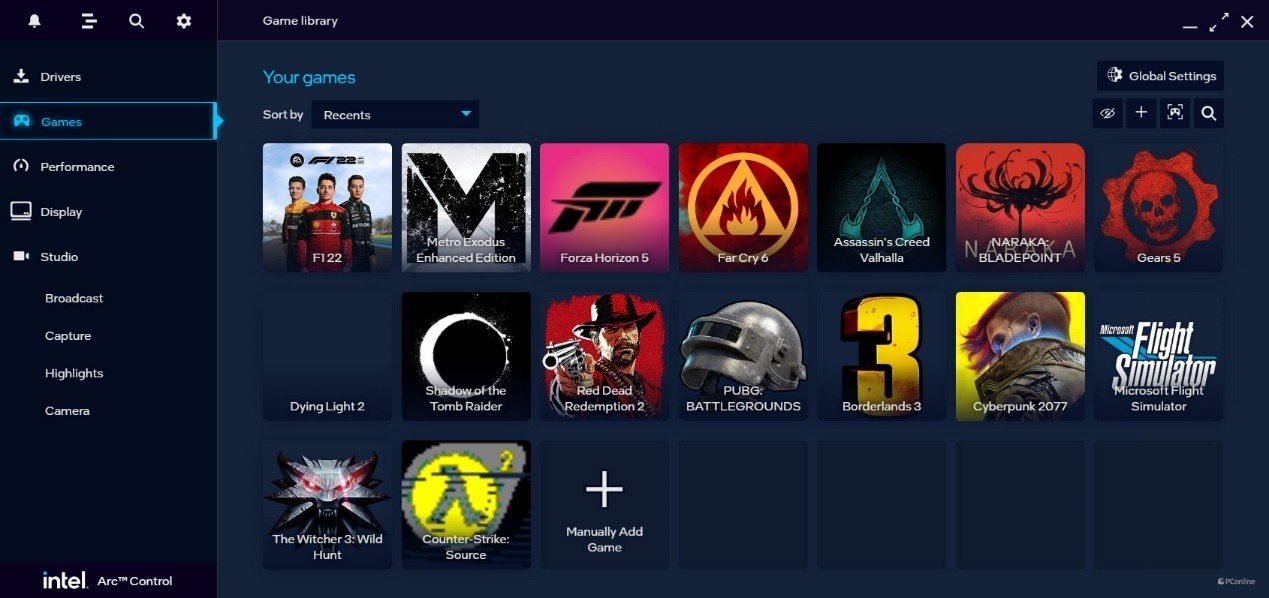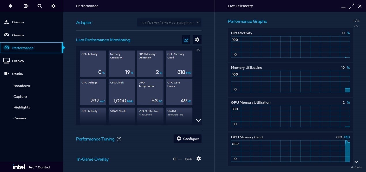 话说回来,让我们看看英特尔Arc控制面板。它的功能还是相当丰富的,自带驱动程度检查&更新、游戏库、性能监控器,以及工作室。