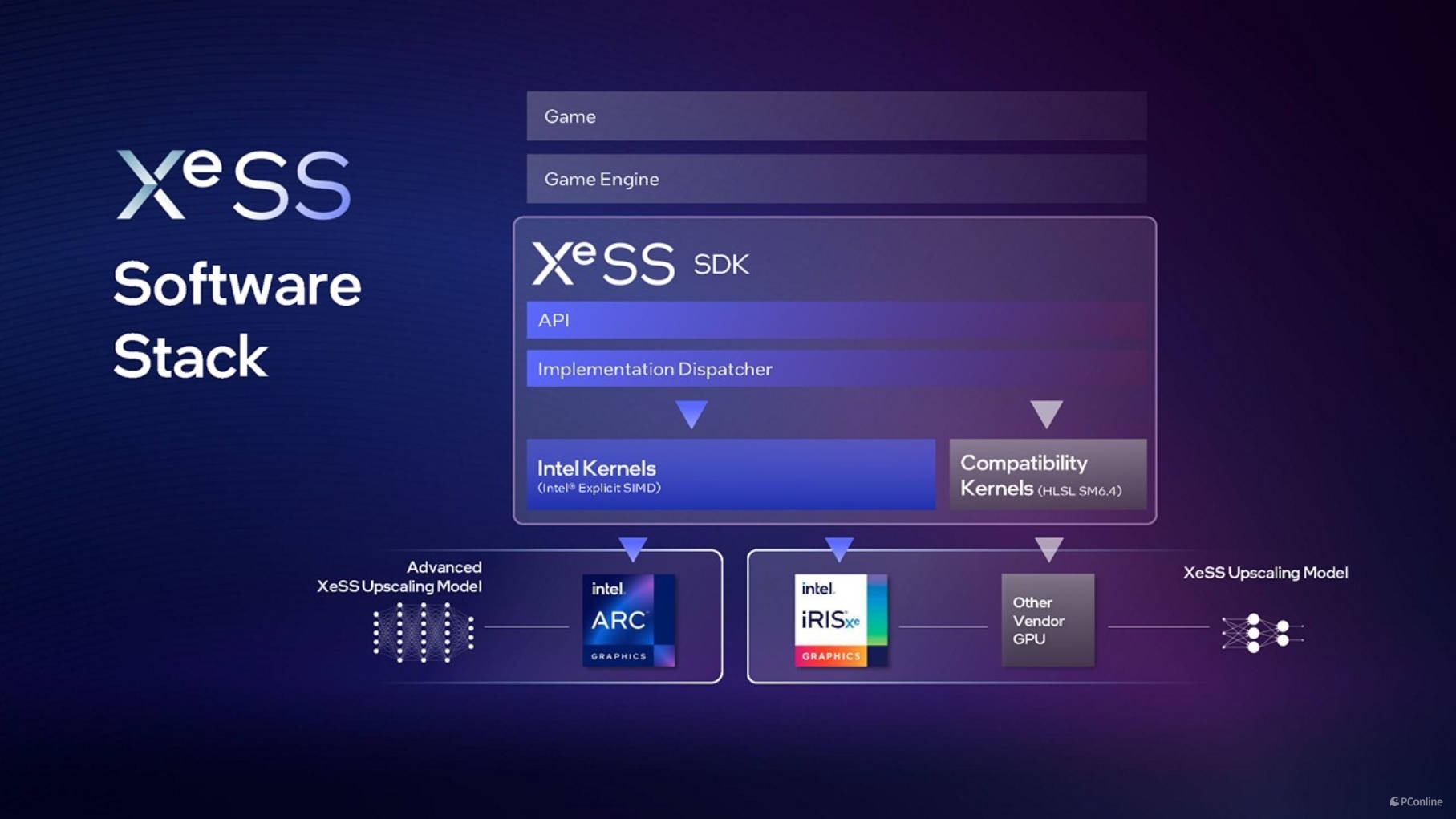 最后讲讲英特尔的XeSS超采样技术,XeSS的实现原理与DLSS或FSR类似,利用显卡内的XMX引擎实现矩阵加速,先将游戏画面分辨率降低进行渲染和前期处理,再由AI处理,提升画面分辨率,最终达到既提高了分辨率画面又提升了游戏体验的效果。官方表示在特定场景下,可以为高画质游戏带来2倍的帧率提升。