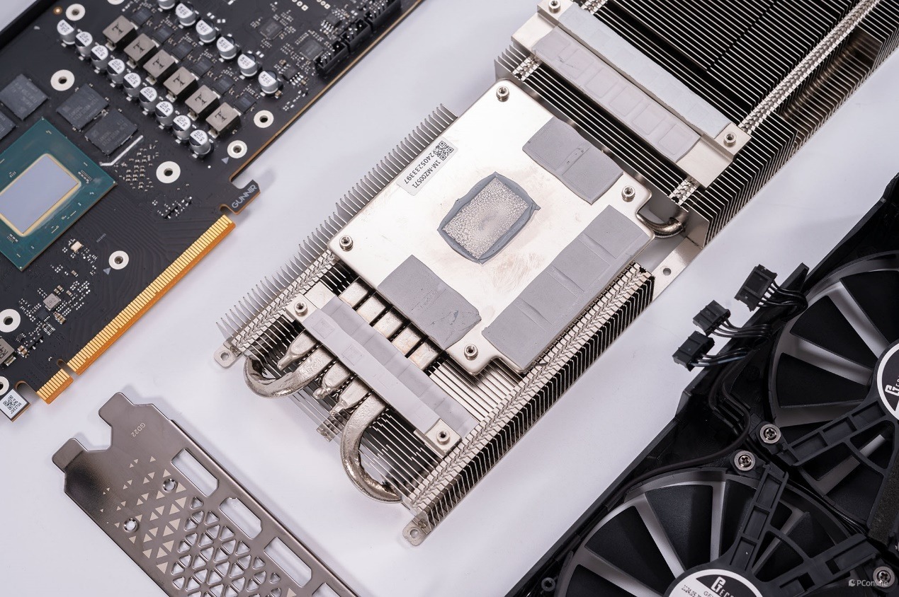 继续拆解,映入眼帘的是这款显卡的散热器——icicle多维散热系统,正面是巨大的金属底座,上面是厚厚的硅脂,能够有效降低核心热量。