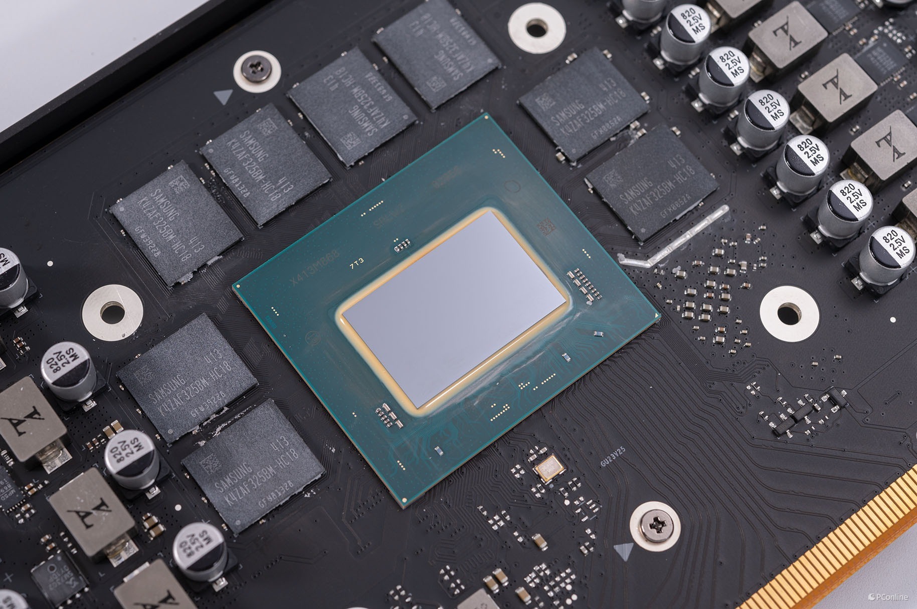 PCB正面相当精致,上面的接口、供电、核心、显存,以及辅助供电位置都相当的合理且规正,妥妥的大厂出品。