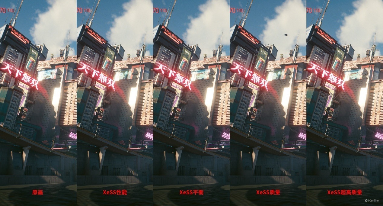 不少玩家可能担心开启XeSS后画面质量会有所下降,这里我们也截取了不同档位中的游戏画面,从肉眼来看,其实画质几乎完全一样。如果是文字、图案等场景下,由于XeSS是通过AI将低分辨率画面渲染成高分辨率画面,因此在清晰度方面还有加成,有时候甚至比原生画质还要清晰。